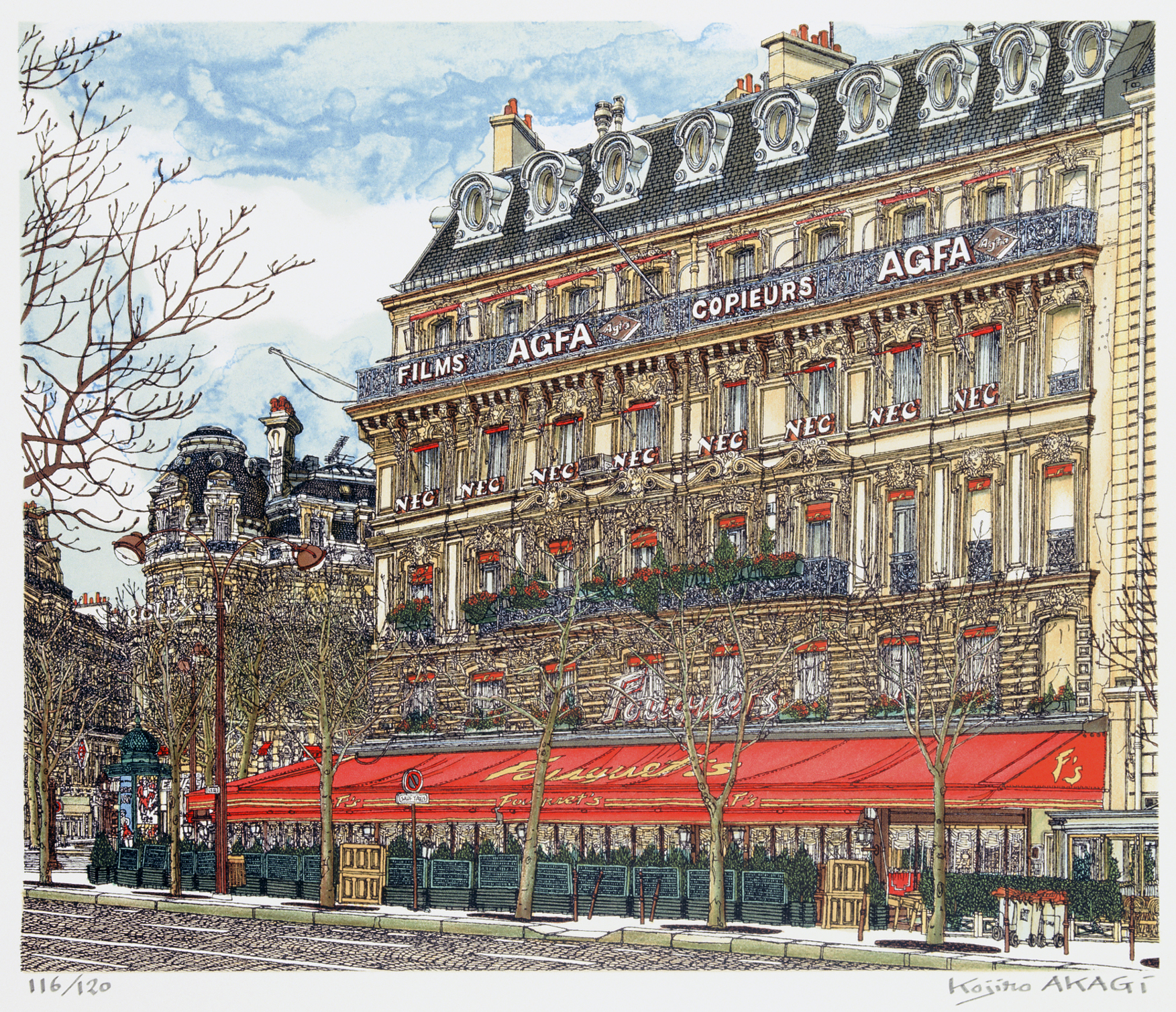 Ses vues de Paris présentent le charme caractéristique des ambiances parisiennes, de ses sites historiques, ses restaurants et grands magasins emblématiques ; Kojiro Akagi nous a laissé le témoignage de son regard attentif et singulier sur les lieux incontournables de la capitale.