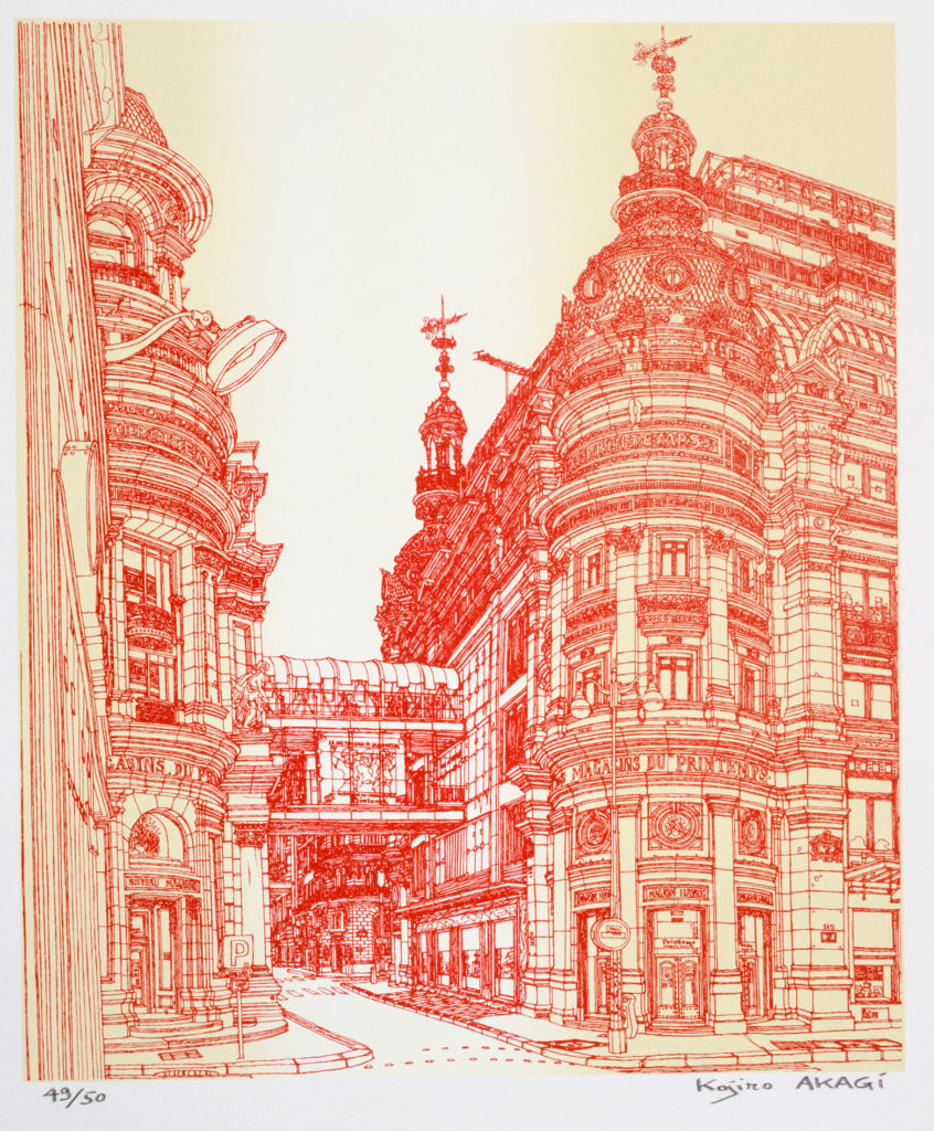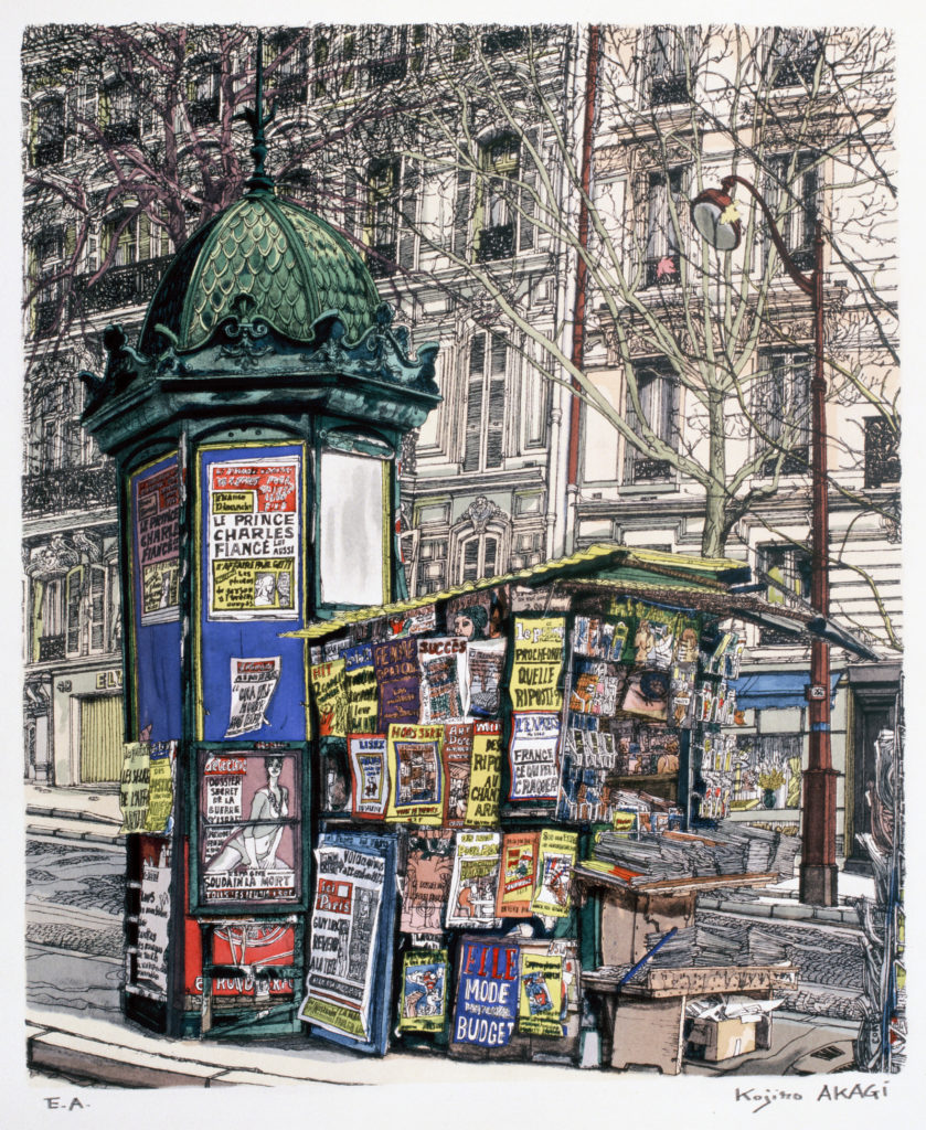 Né au Japon, à Okayama-Shi, en 1934, Kojiro Akagi s’est installé à Paris en 1963, année où il entre à l’Ecole Nationale Supérieure des Beaux-Arts. Il a passé l’essentiel de sa carrière dans la capitale, son lieu d’inspiration et de création. Décédé en 2021, il nous a laissé un corpus magistral. Son œuvre peinte et dessinée, ainsi que ses estampes, sont exposées dans de nombreux musées français et étrangers: à Paris, au musée Carnavalet, au Musée municipal de Toulon, mais également aux Musées du Vatican, au Pat Clark Museum aux USA ou encore, au Musée Royal Ueno à Tokyo.